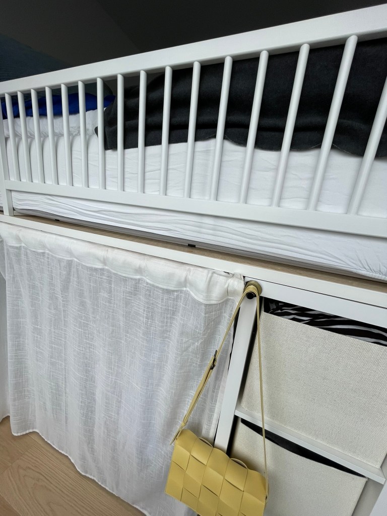 Få fx en seng med indbygget klædeskab og opbevaring.